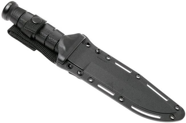 The Cold Steel 39LSFC Leatherneck is a fixed knife with a tactical appearance. The blade is made from German D2 tool steel. This is a non-stainless type of steel with exceptional qualities in terms of sharpness retention and toughness. To protect the blade it is provided with a DLC (diamond-like coating). The handle of this knife is made from Kray-Ex. To make sure you don’t slip and end up on the blade, the knife is equipped with a sturdy steel finger guard.