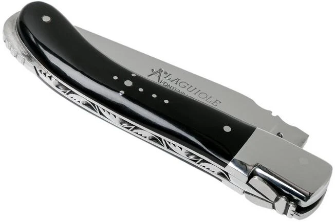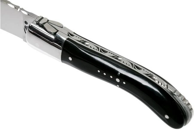 Classic French solidly handmade Laguiole pocket knife. Length closed: 13 cm Equipped with 12c27 steel blade. Handle with black buffalo horn scales.