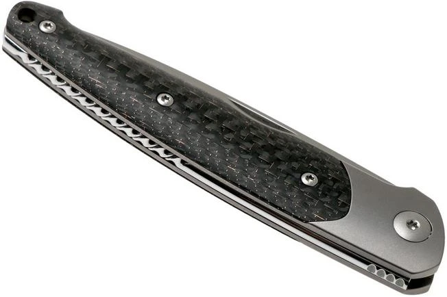 The Viper Key V5978FCB Bolster Bronze Carbon fibre pocket knife is a stylish gentleman’s knife, designed by Jesper Voxnaes. His typical and unique design style is clearly reflected in this remarkable gentleman’s knife. There is almost no straight line in sight. All shapes, lines and details match and form a harmonious whole. The slim design is very appealing and turns it into a perfect gentleman’s knife for anyone who loves wearing a fancy outfit.